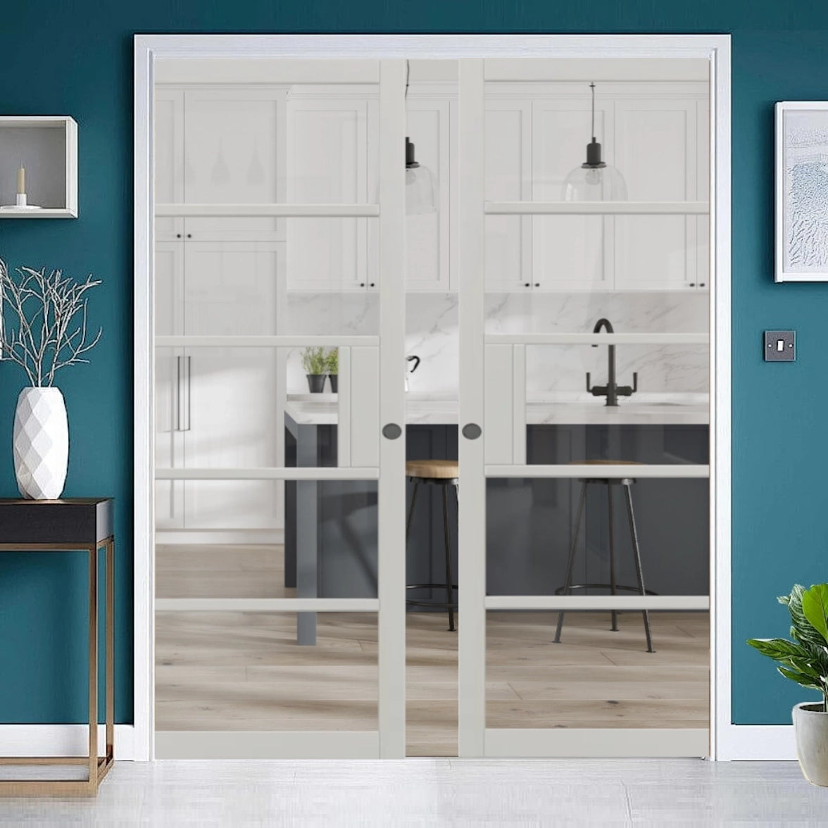 Revamp your living space with our 5L Metro White Industrial Style Double Pocket Door Set, with a modern and industrial touch, this sleek white finish transforms any room, enjoy stylish functionality and easily open up your space with clear glazed doors.