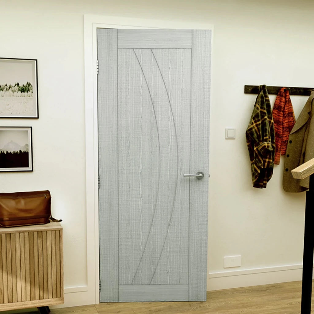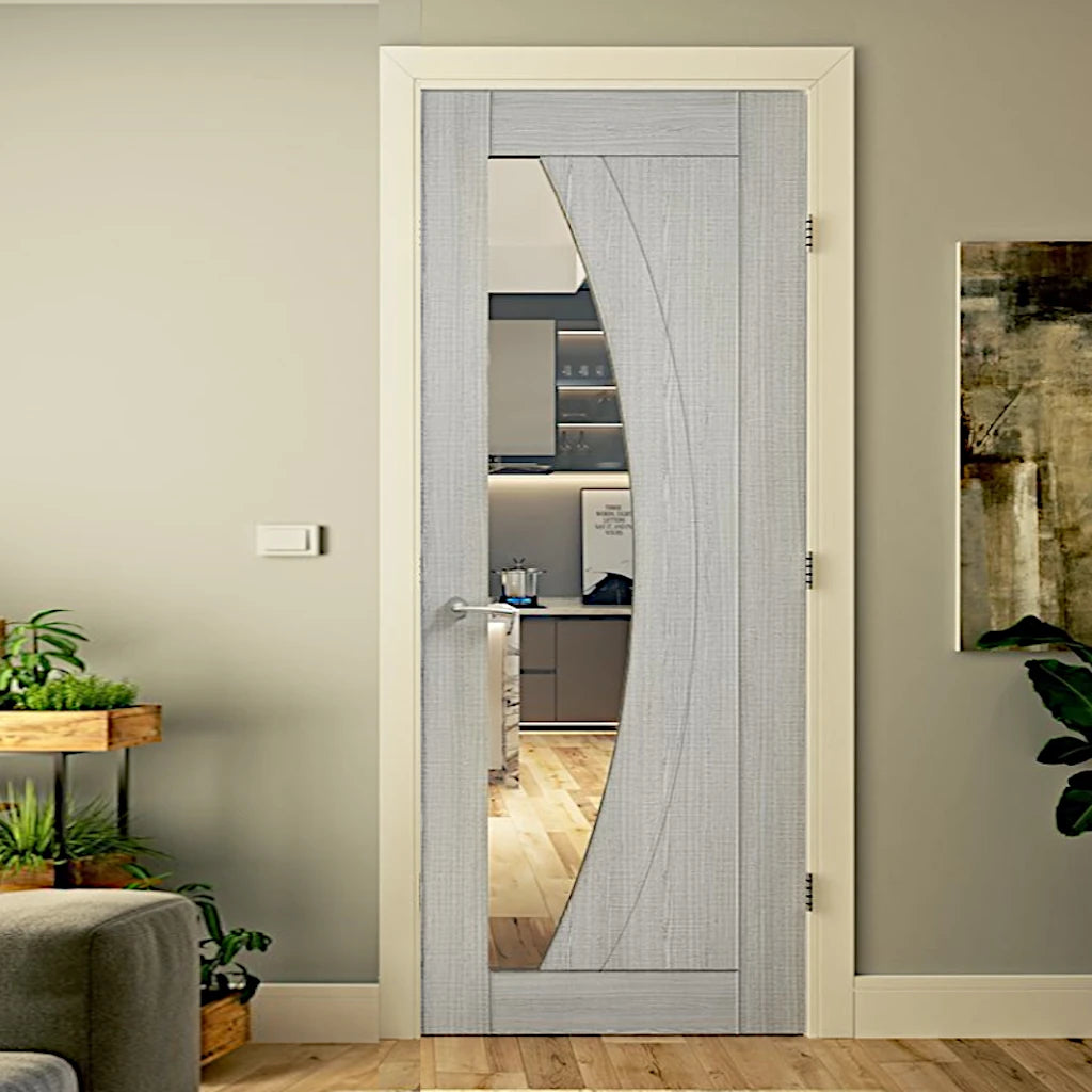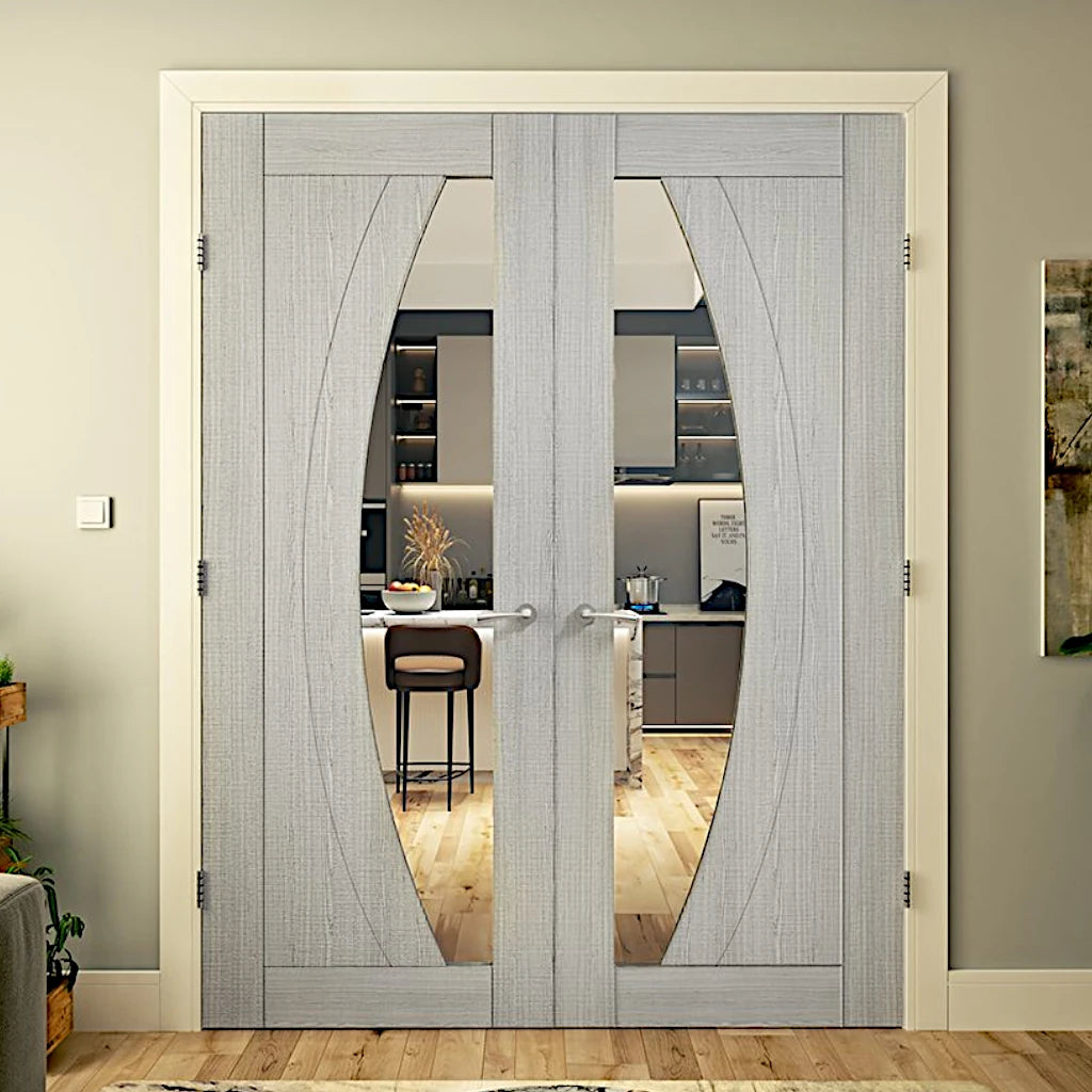 Modernize your home with the Ravello Light Grey Glazed Flush Pocket Door Set! Its unique asymmetrical design and light grey ash veneer give it a remarkable and distinctive appearance. Its clear, curved, toughened glass pane offers natural light and a sense of openness. Enjoy the perfect combination of style and functionality.