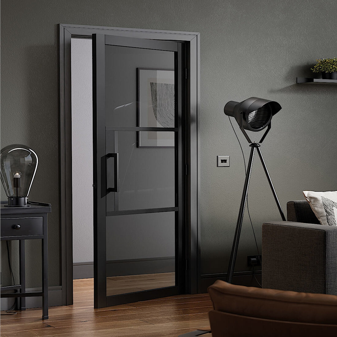 Make a bold statement with the Tribeca Industrial style folding Doors. These doors feature slim-profile frames, ideal for anyone looking to create that "industrial style theme" within their home or apartment. The matt black finish gives the illusion of black metal coupled with large glass panels these doors would be a focal point in any type of environment.