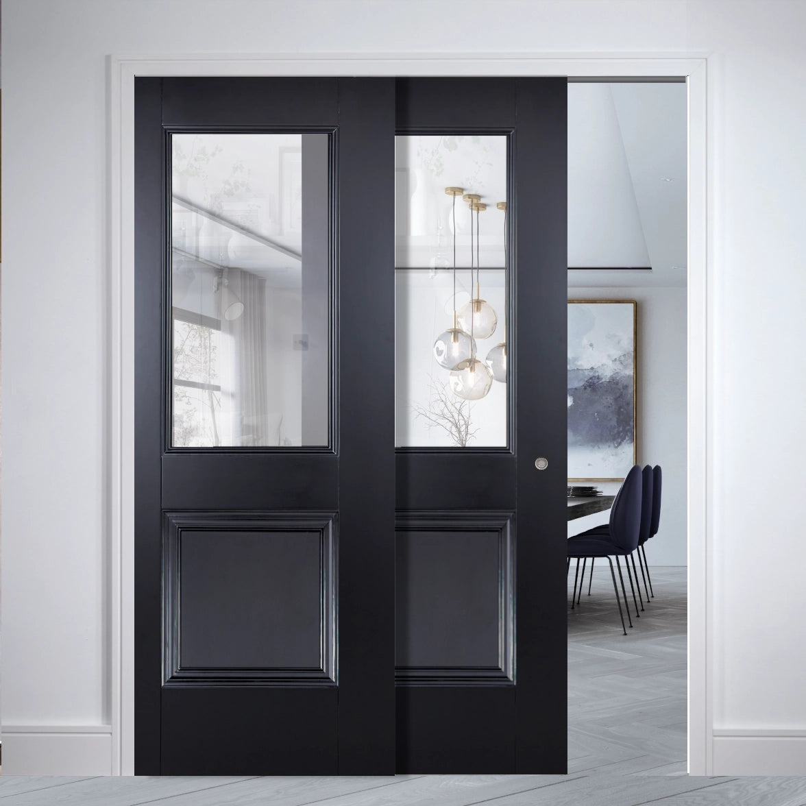 Experience luxury and elegance with our Telescopic Black Arnhem 2P Pocket Door System, featuring two equal sized panels adorned with decorative beading, this unique design adds a touch of opulence to any room, upgrade your space with this sophisticated and functional door system.