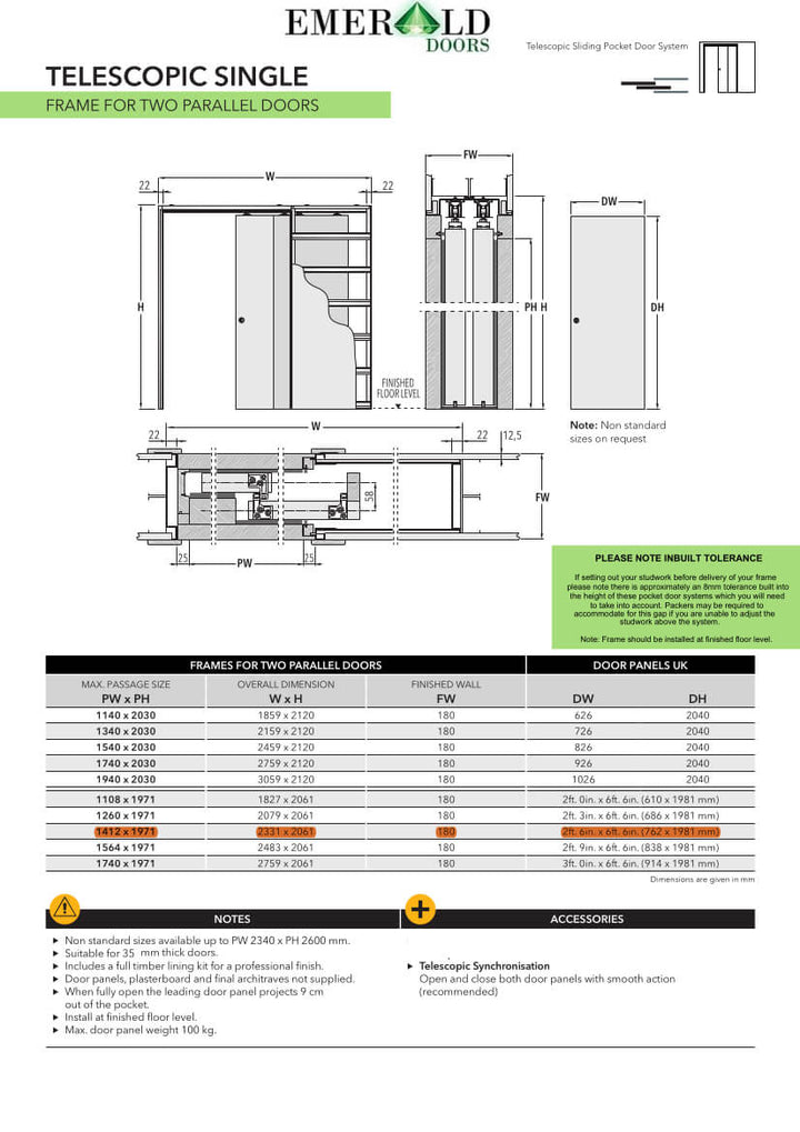 A single telescopic pocket door system allows two door panels to slide back into the same pocket in the wall. Combine this with a synchronization device and your doors will slide into the frame smoothly and simultaneously. The system is supplied with a comprehensive timber lining kit (jambs) to finish the installation perfectly.
