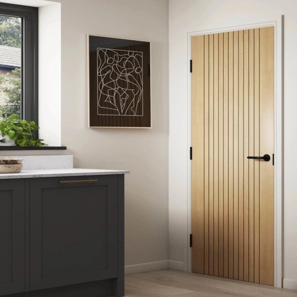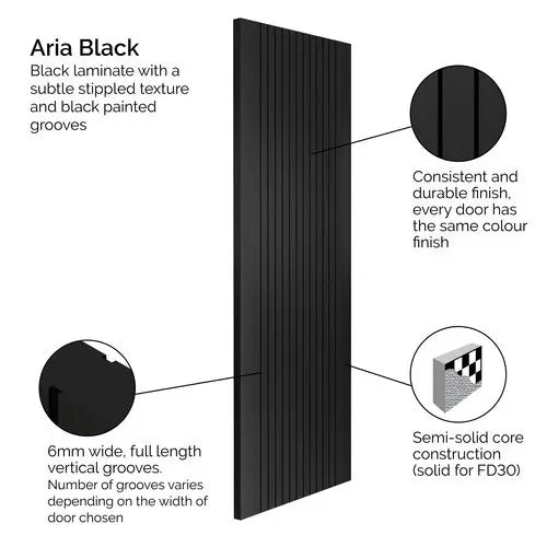 Transform your space with the elegant Aria Black Fluted Internal Door. Its unique design features full-length grooves and a subtle stippled texture, all enhanced by the deep black laminate and painted grooves. Elevate your interior with this chic and modern addition.