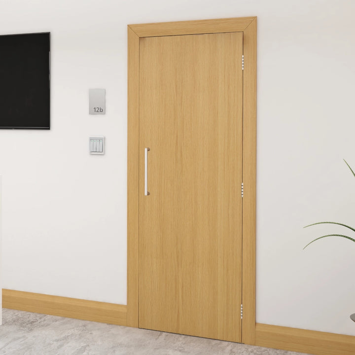 Experience the perfect blend of durability and elegance with our Premium Oak Flush Fire Door FD60. Crafted from hand-selected crown-cut American white oak veneer, it features a smooth closed grain finish with a sophisticated 35% gloss. Solid lippings on all edges enhance strength and longevity, while its adjustable design allows for a precise fit with up to 3mm tolerance on all sides. Ideal for safety-conscious spaces, this fire door combines premium quality with seamless style.