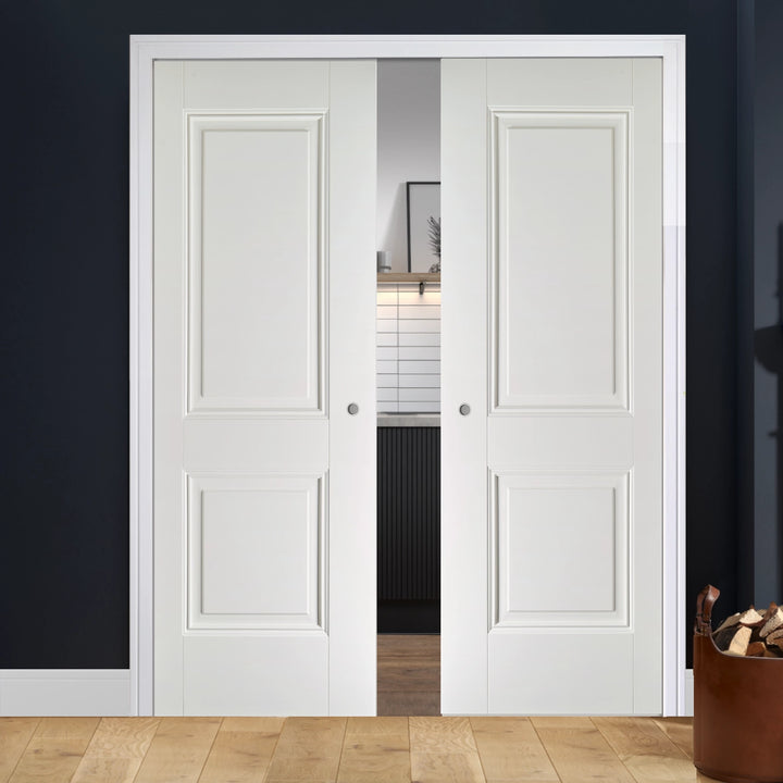 The Arnhem White 2P Double Pocket Door Set features sophisticated internal doors with a classic two-panel design and elegant moulded detailing. The tall upper panel and proportioned lower panel create a balanced, timeless look ideal for both modern and period-inspired interiors. This door brings a touch of refined luxury and architectural character to any space. Pocket doors save space while enhancing the flow between rooms, making it perfect for both stylish and practical living.