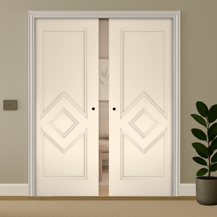 Elevate your home with the Ascot White Pocket Door Set, where timeless design meets unwavering quality. This architectural gem features a single bevelled panel adorned with captivating diamond moulding, positioned subtly below centre to create visual depth and interest. The decorative centre panel and carefully crafted inset profile bead deliver understated luxury. Built for longevity and designed to impress, the Ascot is the discerning choice for those who refuse to compromise between strength and style.