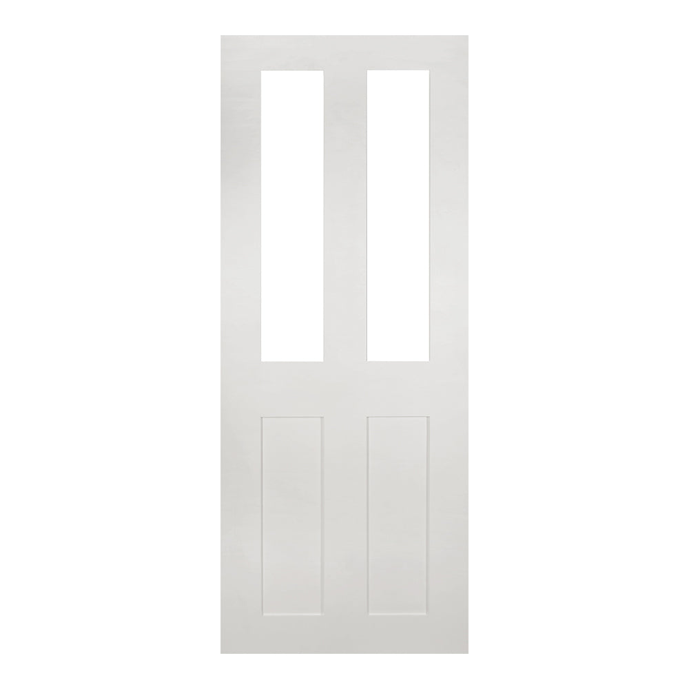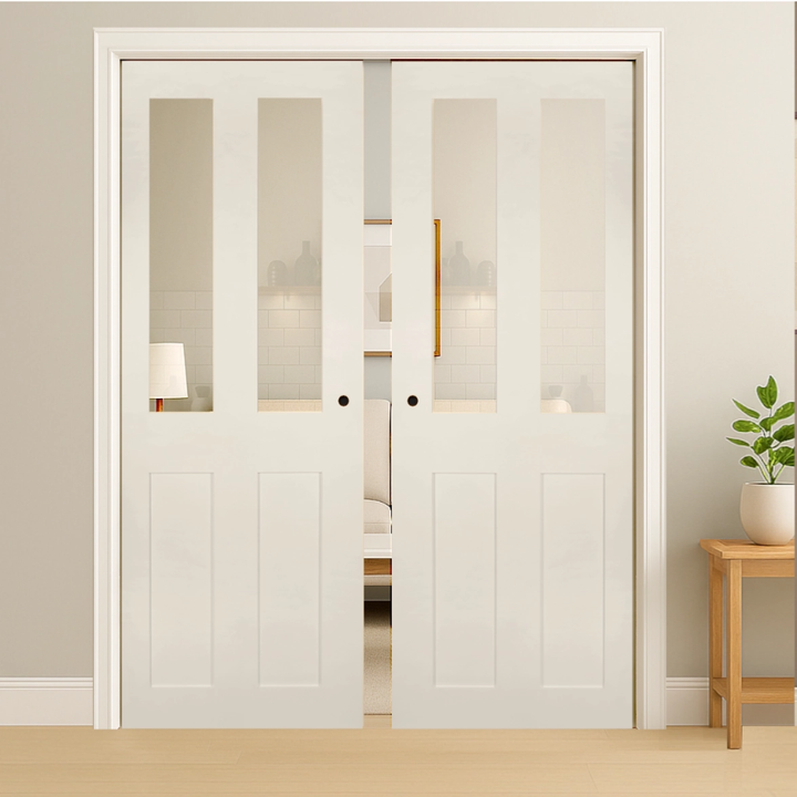 The Eton White Clear Glazed Double Pocket Door Set combines understated elegance with practical design. Its classic shaker-style frame features four panels with subtly varied proportions, creating visual interest without compromising sophistication. Two clear toughened glass panes replace the upper panels, flooding your space with natural light whilst maintaining privacy below. The solid white primed finish offers a versatile canvas for any interior scheme, seamlessly complementing both contemporary and traditional settings. Perfect for maximising light flow between rooms whilst preserving the timeless appeal of traditional door styling.