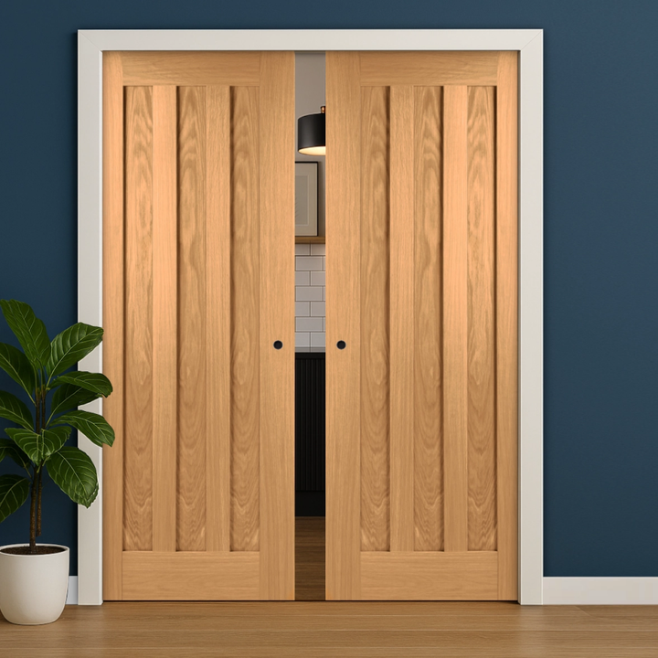 Transform your interior spaces with the Idaho Oak Double Pocket Door Set, where contemporary design meets timeless elegance. Featuring a refined Oak veneer finish and three striking recessed centre panels, this modern double pocket door system delivers sophisticated style without compromising on functionality. The sleek, minimalist lines create a seamless aesthetic that complements any décor. Perfect for creating fluid transitions between rooms, this statement piece elevates your home's architectural appeal with understated luxury and practical innovation.