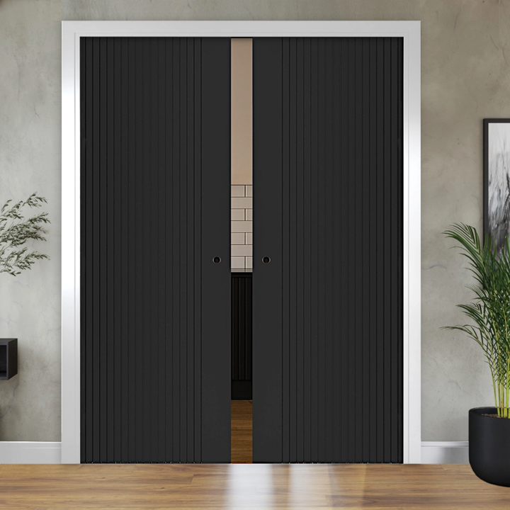 The Malmo Black Double Pocket Door Set delivers contemporary elegance with its commanding black finish and distinctive slatted design. Perfect for modern homes seeking a statement piece, this door combines striking aesthetics with practical functionality. The sleek slatted pattern creates visual interest whilst maintaining clean lines that complement any interior scheme. Ideal for those who refuse to compromise on style, the Malmo transforms ordinary spaces into sophisticated rooms that impress. A bold choice for homeowners ready to elevate their décor with confidence and character.