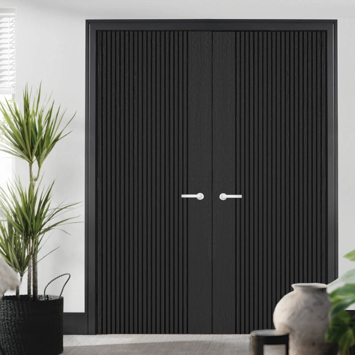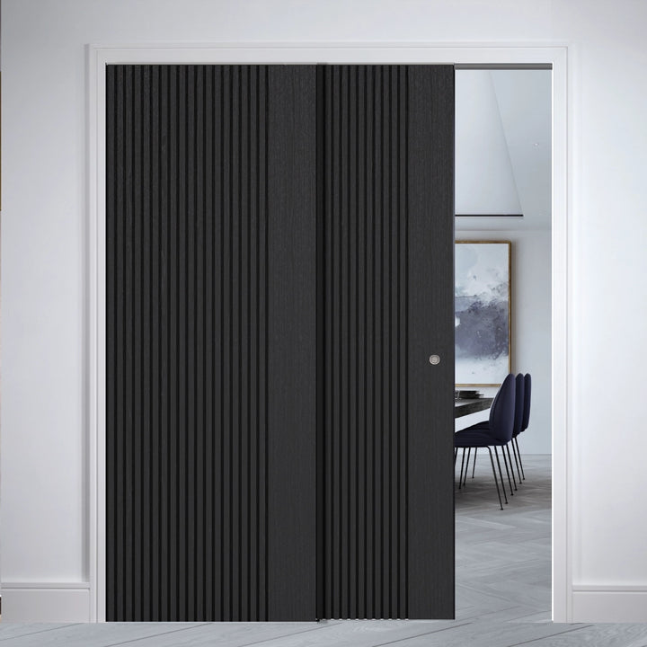 Revamp your home with our Ash Grey Melbourne Telescopic Pocket Door System, this modern and fashionable door is pre-finished and ready to hang making installation a breeze. Its unique and trendy design, featuring deep square cut vertical grooves will add a touch of style to any large space.