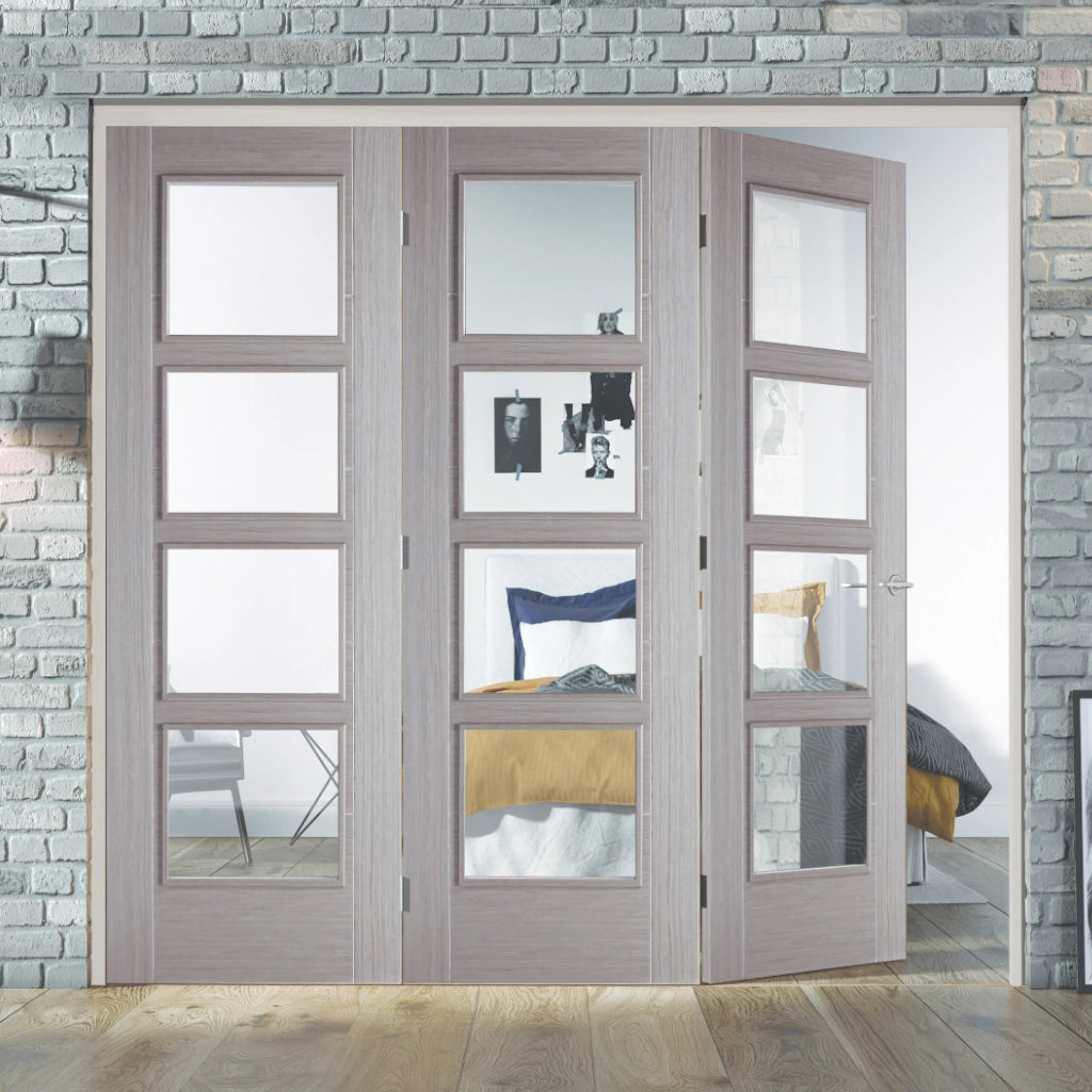 The Contemporary Light Grey 6006 room divider is available in 4 configurations, a 3 leaf, 4 leaf, 5 leaf and 6 leaf system. The Frame is supplied complete with the Top Track, Top Pivot, Apron Plate, Bottom Pivot and Chrome Hinges. There is no bottom frame or floor guide with this door set therefore the flooring can continue between rooms The frame is supplied in unfinished oak and would require painting on-site.