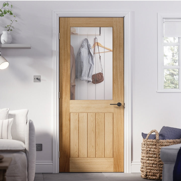 Engineered in construction for strength and stability, with a particle board core and solid Oak lippings, then faced with a real Oak veneer. The Belize glazed door is supplied unfinished allowing you to finish with a good quality finishing product, thus creating your own result which is ideal if you are looking to match with existing furnishings. Also available in a standard internal door and fire door.