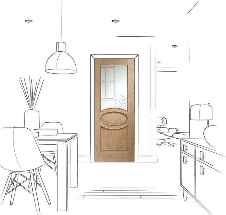 The Calabria Oak door features a decorative moulding around the lower timber panel and also the glass panel, The glass features a bevelled edge which in return gives this door a high quality appearance. The unique oval shape in the centre of the door gives this door a distinctive style.
