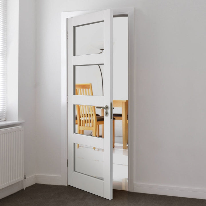 Light and refreshing the Calypso range offers excellent value for money, a shaker style panel door with high quality white primer then fitted with clear safety glass.