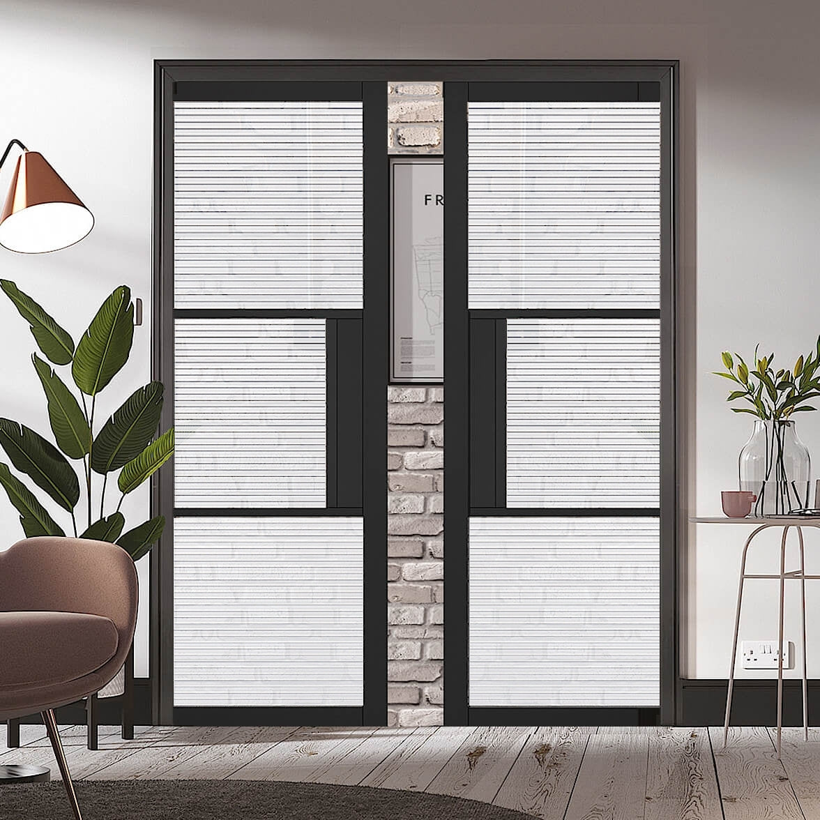 Tribeca Black Reeded Glazed Double Doors with Double Sliding Track