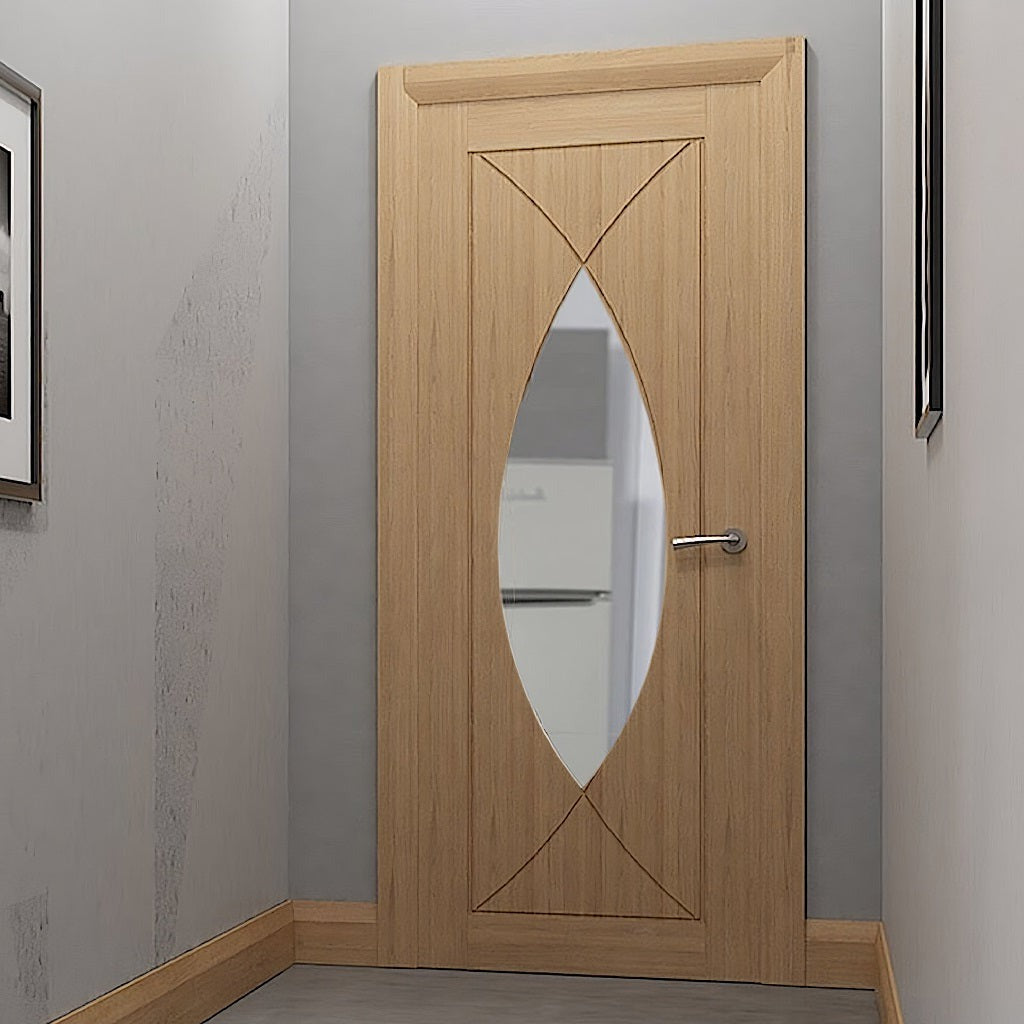 The stylish Amalfi door is the perfect accent to any modern décor. Its clear glazed design features a bevelled-cut, oval pane to maximize natural light and show off the beautiful, crown-cut oak veneer. Create a sophisticated, airy look with this durable, flush door design.