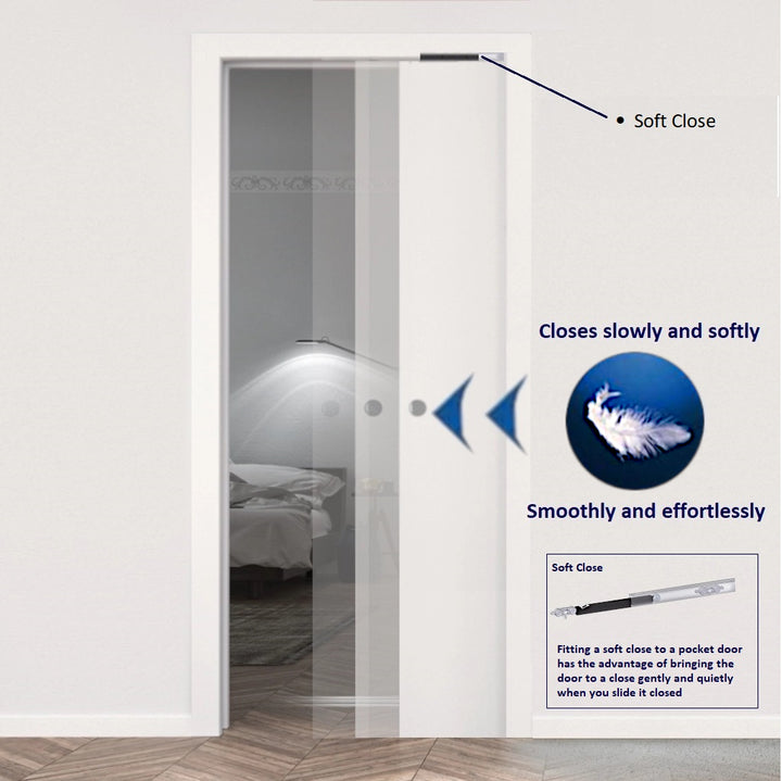 There is no bottom track or threshold strip, as with all our pocket door systems the single pocket door frame is top hung from a track. Inside the track, there are runners which are attached to the top of the door via a bracket. This means there is no threshold strip or track in the floor and your flooring can continue through the opening undisturbed. Accessories such as soft door closers, flush door pulls, and bathroom locks can all be purchased separately,