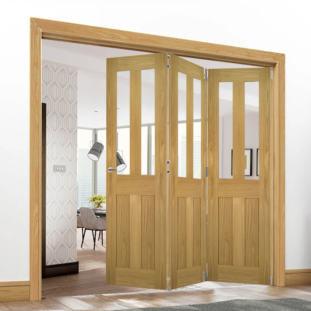 Anchor your style with the classic, chic design of the Eton Oak Clear Glazed Flush Pocket Door Set. Delicate yet strong, two pairs of straight-cut panels lend this shaker-style door a modern edge. With clear, toughened glass, let natural light in while hard wax oil emphasizes the patterns in the unvarnished oak. Feel proud of this timeless piece.