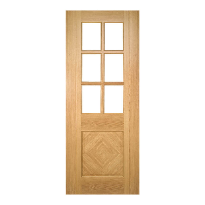 The Kensington Oak Glazed Flush Pocket Door System brings a classic sophistication to any home. Its timeless diamond match veneers and six panels of clear glass give a beautiful glint of natural light to the room. Installed, it provides a stunning and unique touch to any interior.