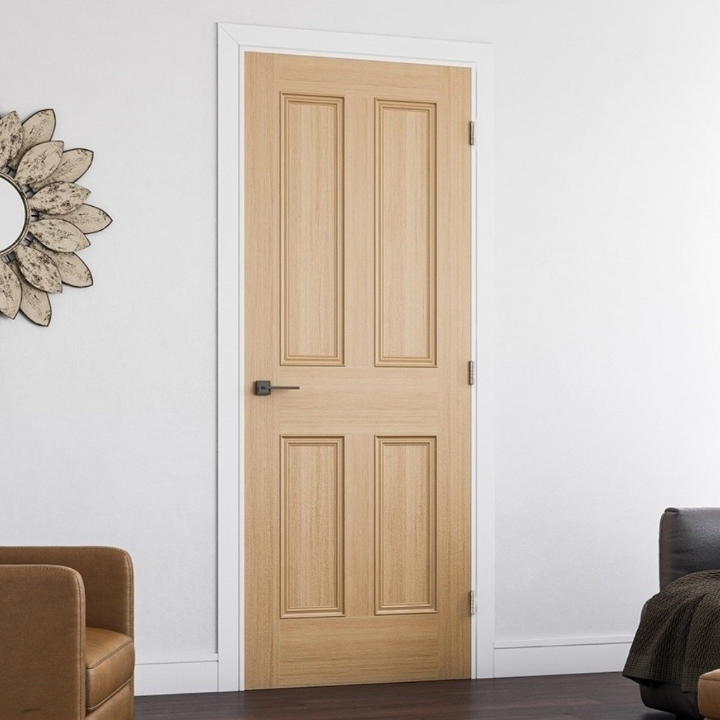 Add the warmth and beauty of nature to your home with the Kingston Oak Flush Pocket Door Set. Crafted from real unfinished oak veneer and featuring four bevelled panels, this door will draw the eye and leave a lasting impression. Wax oil will bring out the unique grain and further reveal its natural beauty.