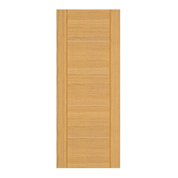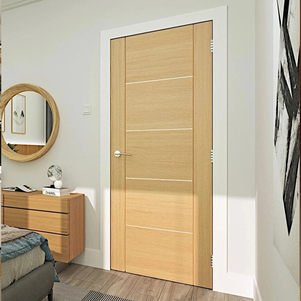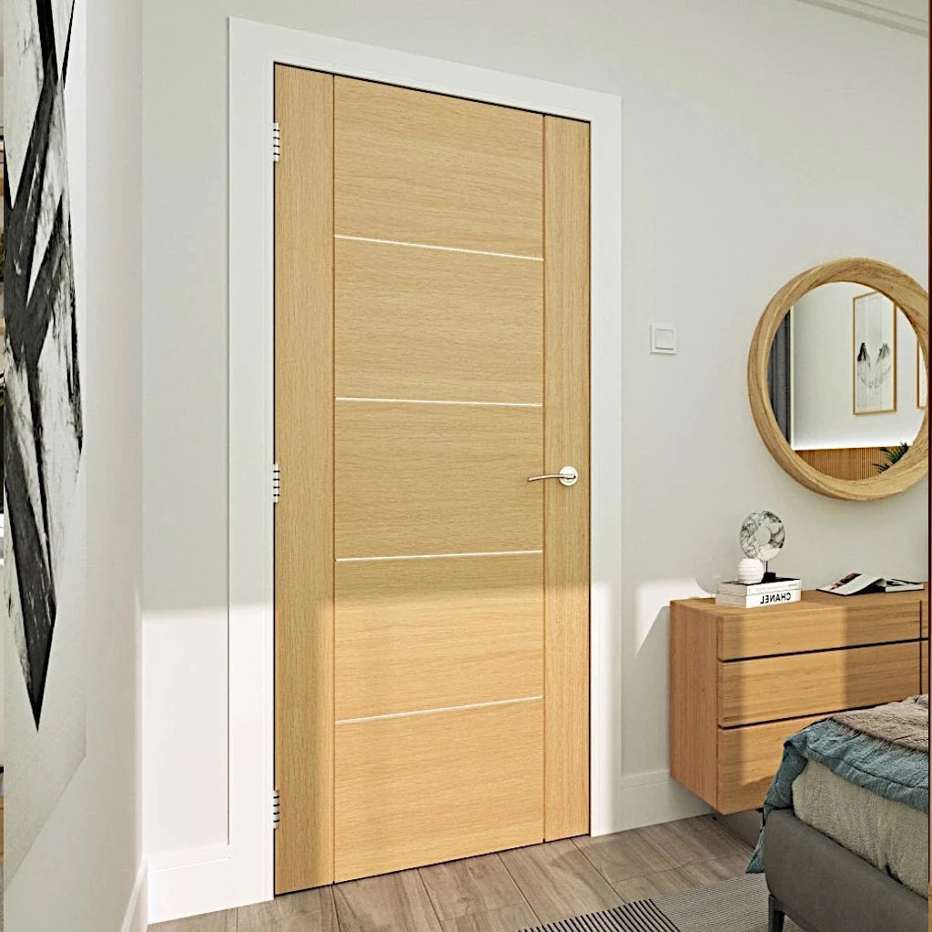 This Valencia Oak Flush Pocket Door Set is the perfect combination of natural beauty and modern sophistication. Its crown-cut oak veneer panels offer a breathtaking display of natural grain, while sleek aluminium inlays provide just the right amount of contemporary charm.