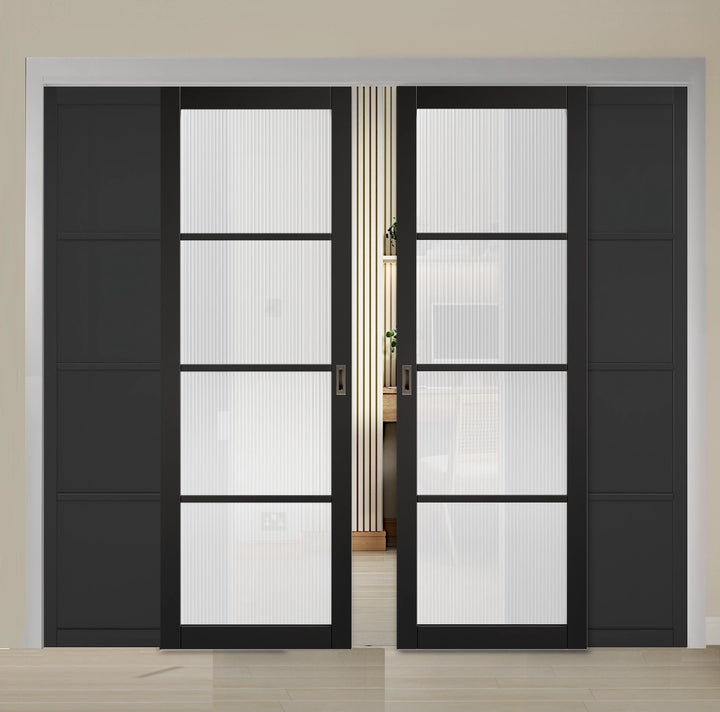 Soho Black Reeded Glazed Sliding French Doors with Fixed Panel