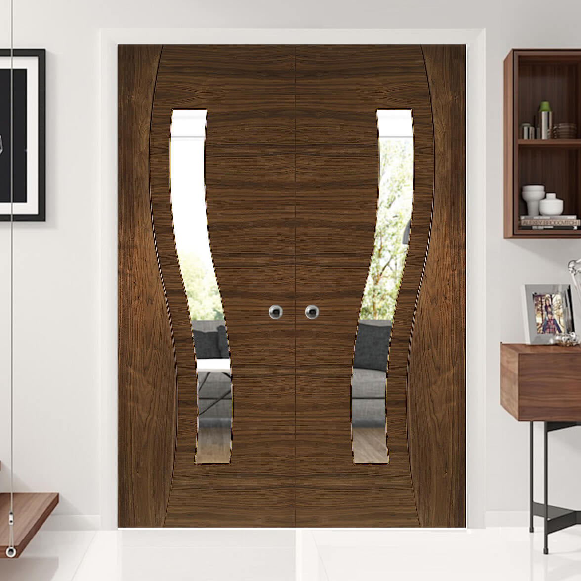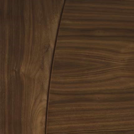 Contemporary walnut Cadiz door with crown cut veneers and solid walnut inset, handcrafted to a curve design. Supplied fully finished.