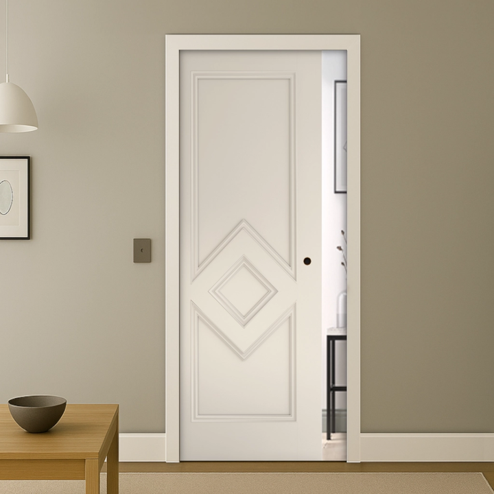Elevate your home with the Ascot White Pocket Door Set, where timeless design meets unwavering quality. This architectural gem features a single bevelled panel adorned with captivating diamond moulding, positioned subtly below centre to create visual depth and interest. The decorative centre panel and carefully crafted inset profile bead deliver understated luxury. Built for longevity and designed to impress, the Ascot is the discerning choice for those who refuse to compromise between strength and style.