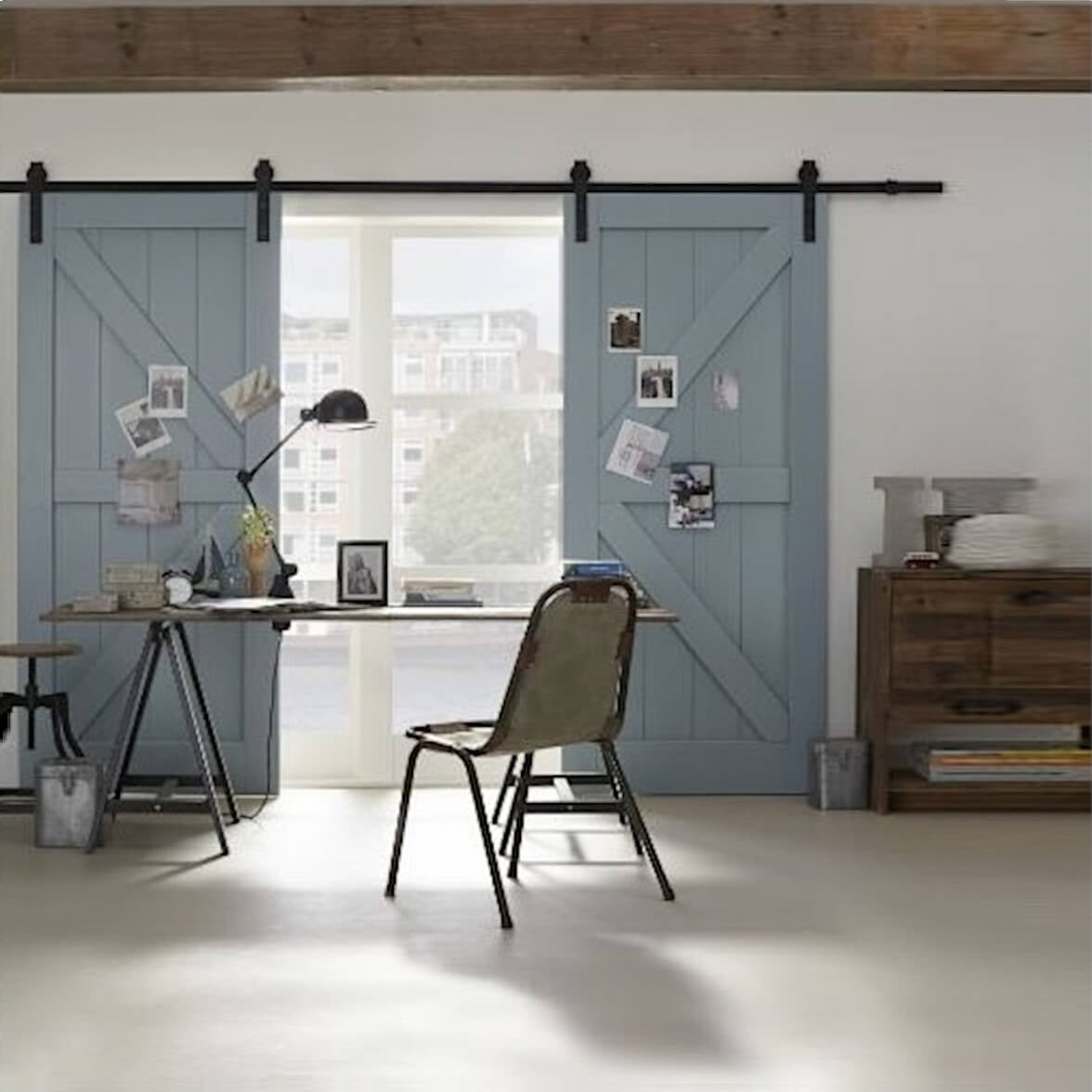 A designer barn door sliding door system with black carbon steel 2m track. Rustic looking single wheel door hangers glide gracefully along the carbon steel track. Perfect for timber frame houses or more traditional interiors where a rustic look is desirable. This type of rustic space-saving sliding door gear is great for kitchens, pantries and utilities but also as a feature for sittings rooms, dining rooms and bedrooms.