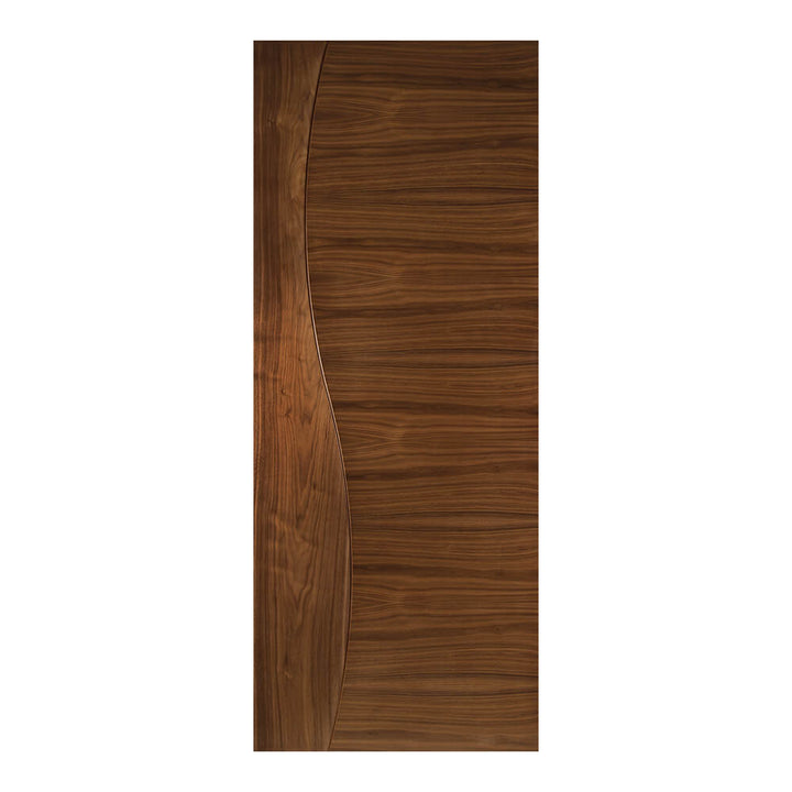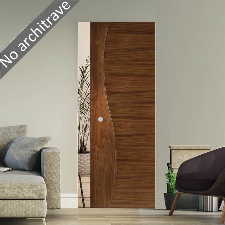 The Cadiz Walnut Flush Pocket Door Set is a stunning piece featuring real North American black walnut veneer and crown cut for intricate grain patterns. Its lack of symmetry gives it an extraordinary look, adding colour, curves, and fluidity to your space. Transform your home with this luxurious design.