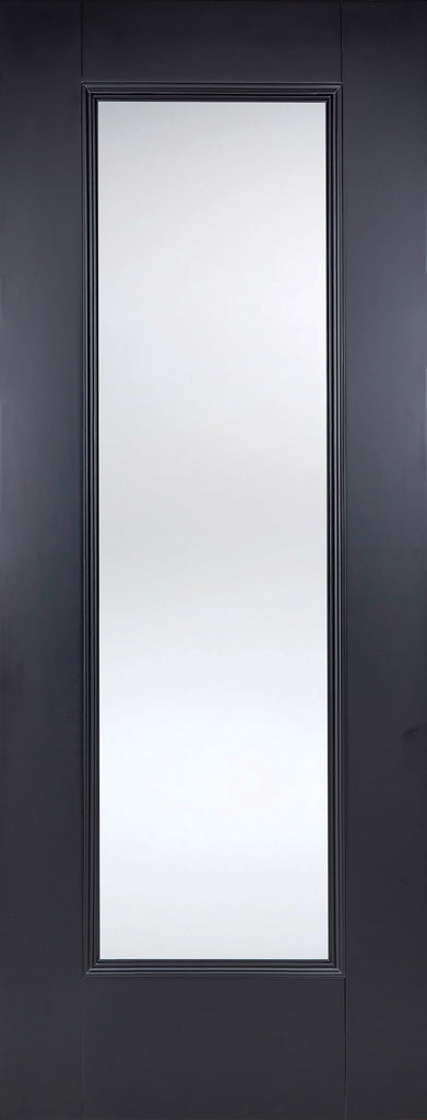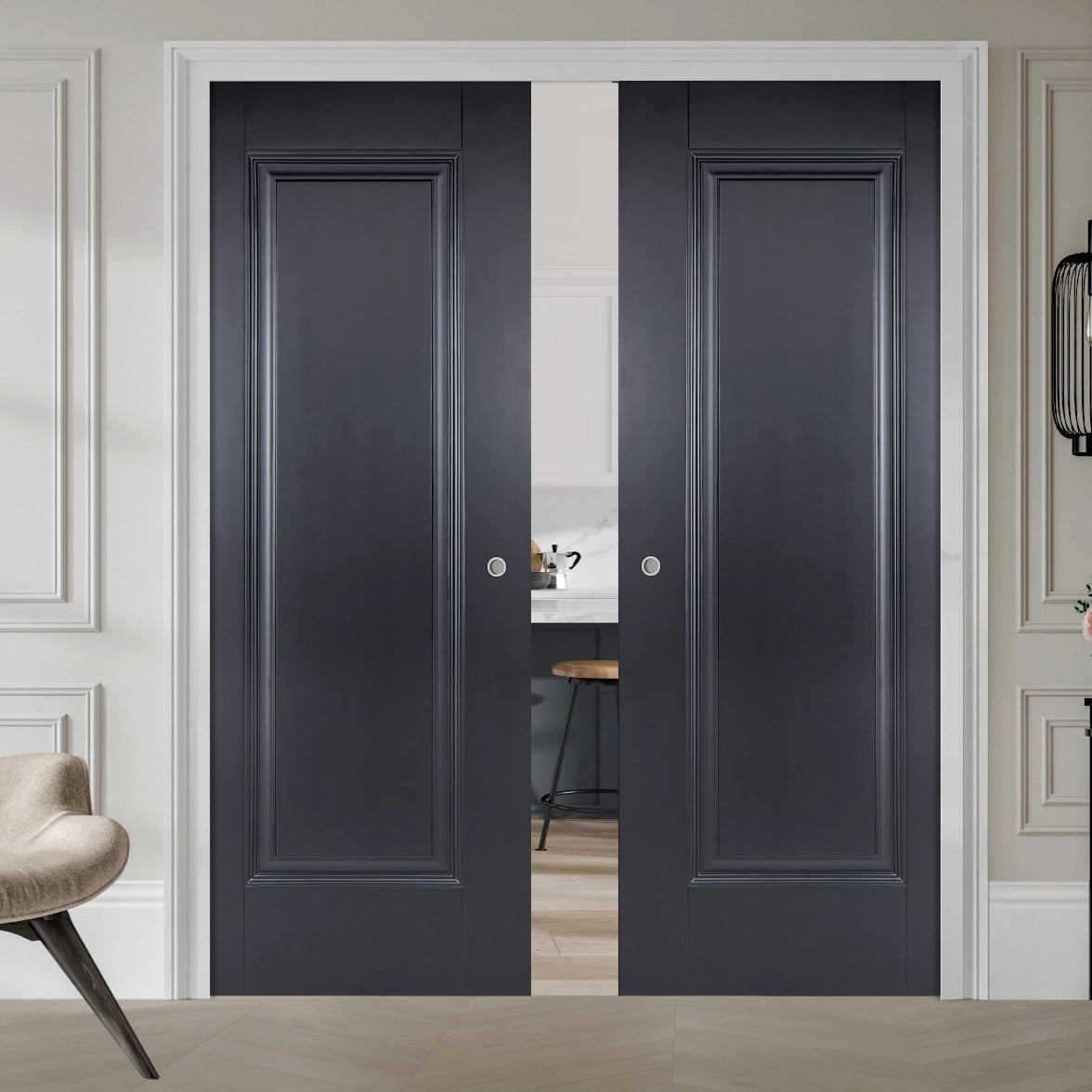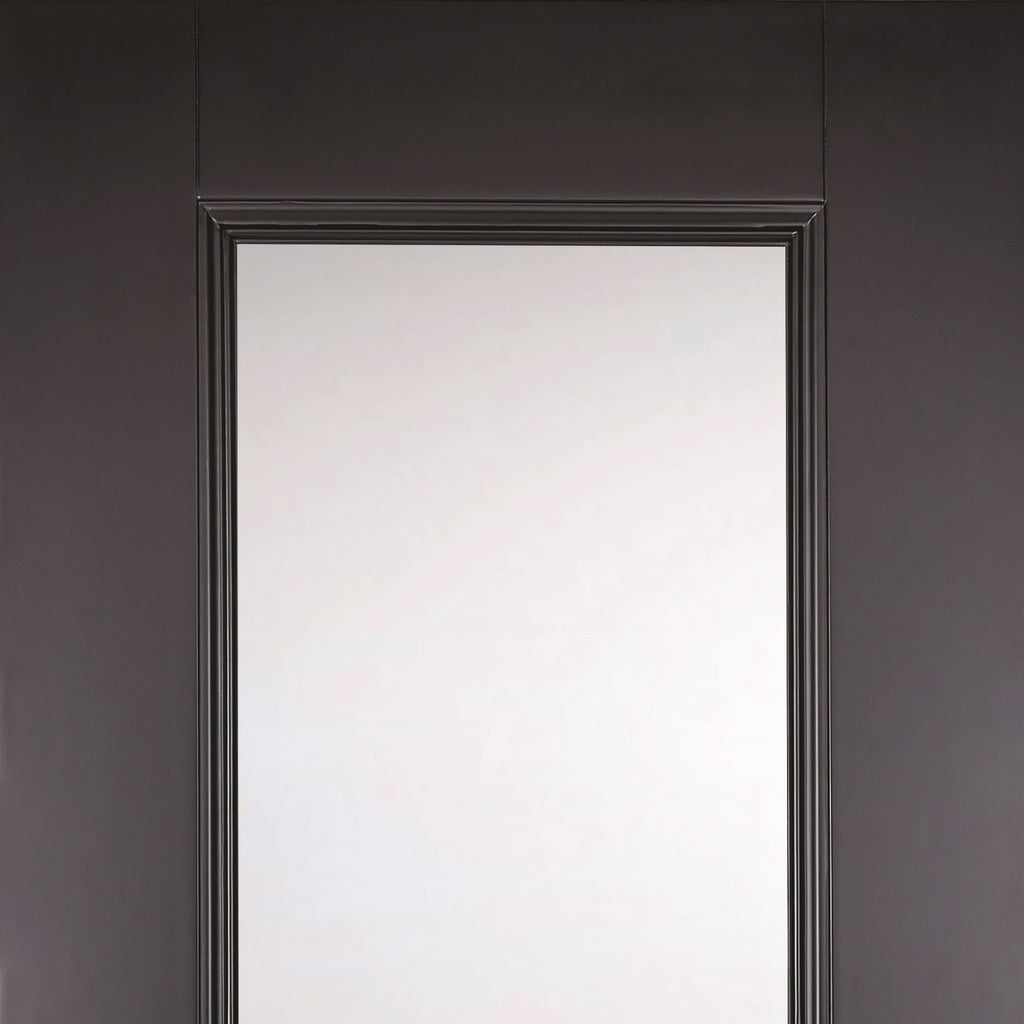 The Eindhoven Black Clear Glazed Double Pocket Door Set features elegant doors with a generously sized clear glazed panel, designed to enhance light flow throughout modern and traditional interiors. The refined moulded detailing around the pane adds depth and a touch of classic sophistication. Supplied primed and ready for final finishing, it delivers standout design with versatile application across residential and commercial spaces. Pocket doors save space while enhancing the flow between rooms, making it perfect for both stylish and practical living.