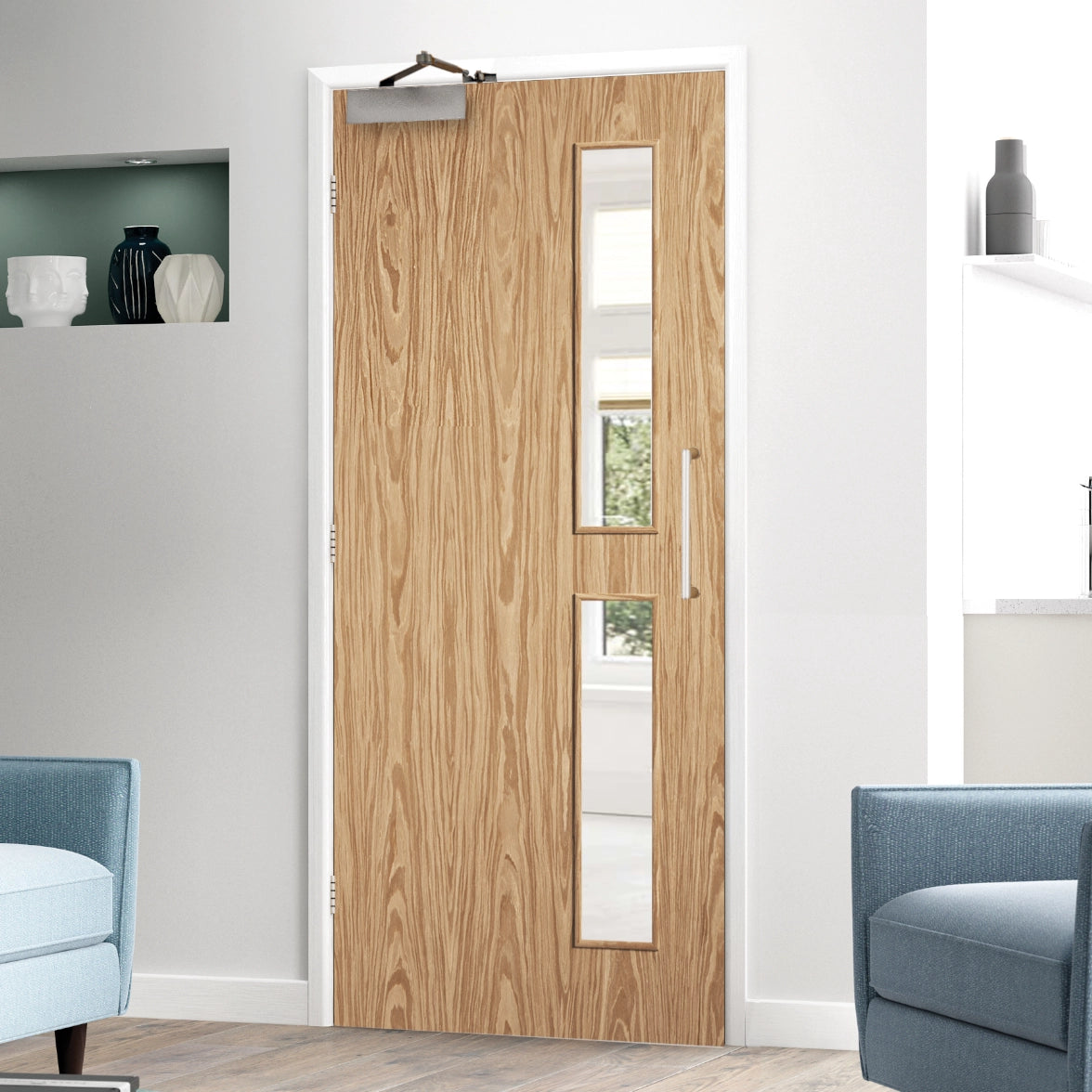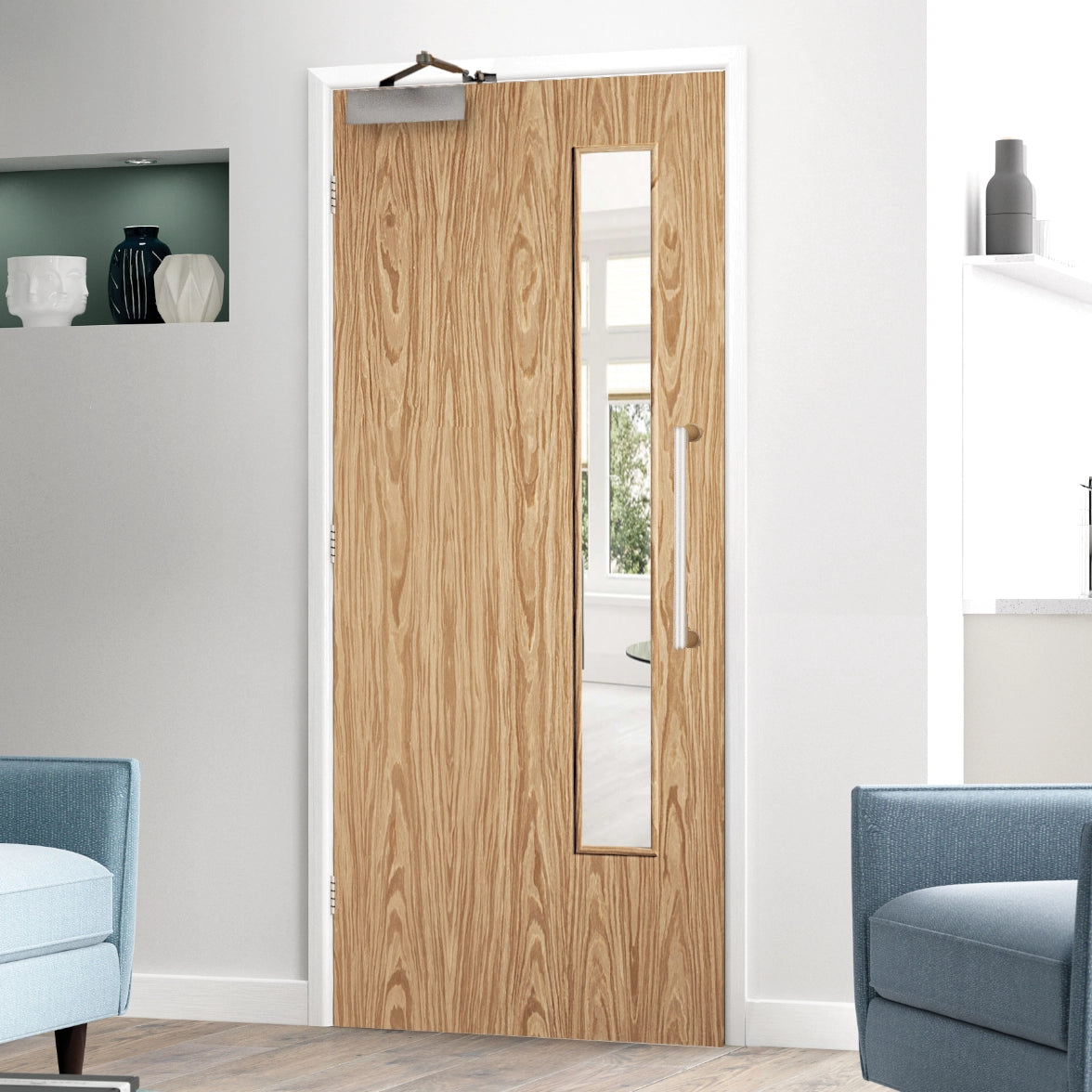 Elevate your space with our Flush Oak 16G Fire Rated Door FD30. Expertly crafted in Spain using premium A-grade American White Oak Veneer over a solid engineered core, this pre-finished door combines sophisticated clear glazing with essential 30-minute fire protection. Its elegant design and superior construction make it the perfect choice for discerning offices, hotels, and commercial interiors where safety cannot compromise style.