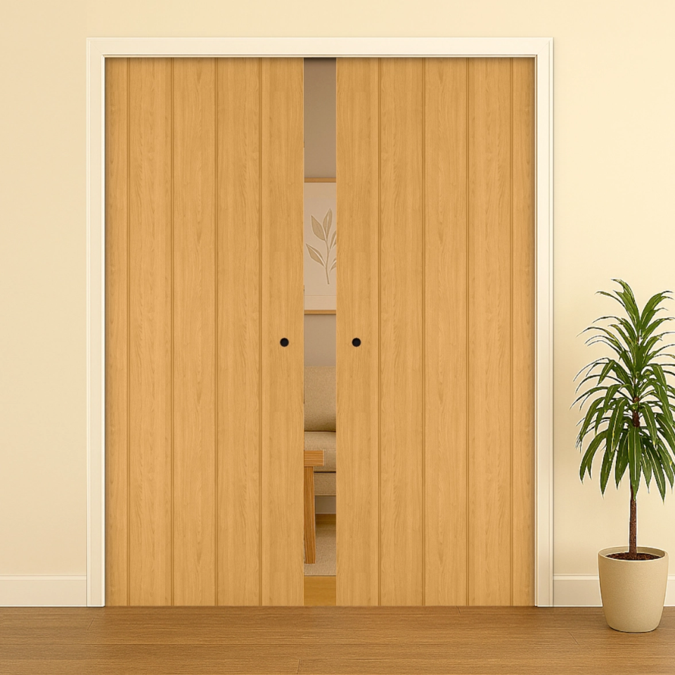 Discover timeless elegance with the Galway Oak Double Pocket Door Set. Featuring stunning crown cut oak veneer over a robust solid core, this door combines durability with sophisticated aesthetics. Five precision bevel-cut vertical panels create a striking visual display, allowing the magnificent oak grain to take centre stage. Perfect for homeowners seeking a statement piece that delivers both strength and refined style, the Galway transforms any space with its classic appeal and superior craftsmanship.