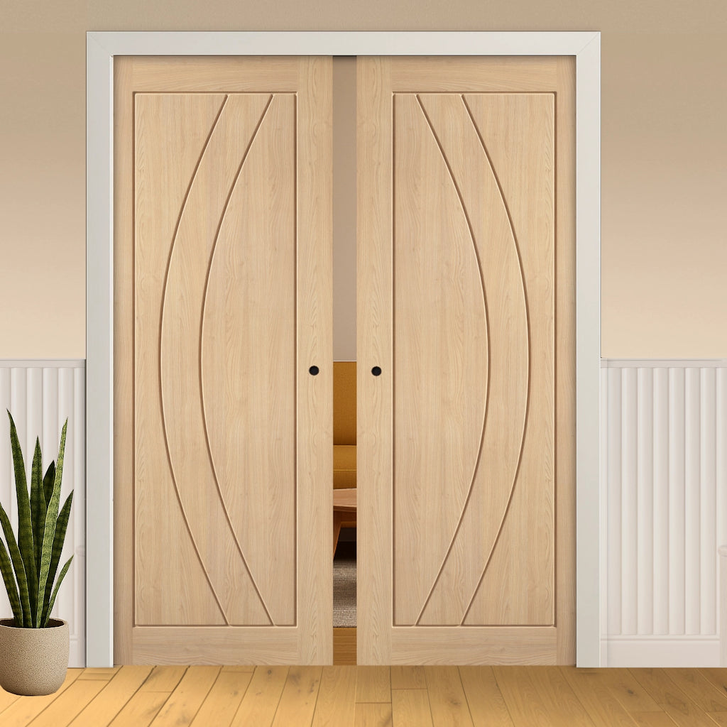 Elevate your home with the Girona Unfinished Oak Double Pocket Door System, where refined craftsmanship meets contemporary style. Featuring two gracefully curved grooves, this striking door delivers a modern aesthetic that complements any interior scheme. The unfinished oak construction showcases natural wood grain, allowing you to customise the finish to match your décor perfectly. The double pocket design maximises space efficiency by sliding discreetly into walls, making it ideal for open-plan living or compact rooms. Built for durability and smooth operation, this door combines visual sophistication with practical functionality, transforming your spaces into something truly exceptional.