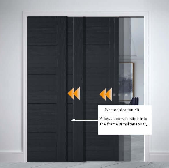 A single telescopic pocket door system allows two door panels to slide back into the same pocket in the wall. Combine this with a synchronization device and your doors will slide into the frame smoothly and simultaneously. The system is supplied with a comprehensive timber lining kit (jambs) to finish the installation perfectly.
