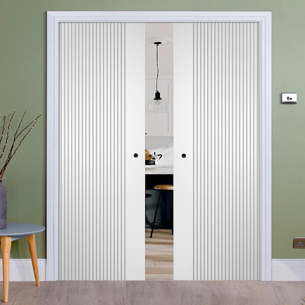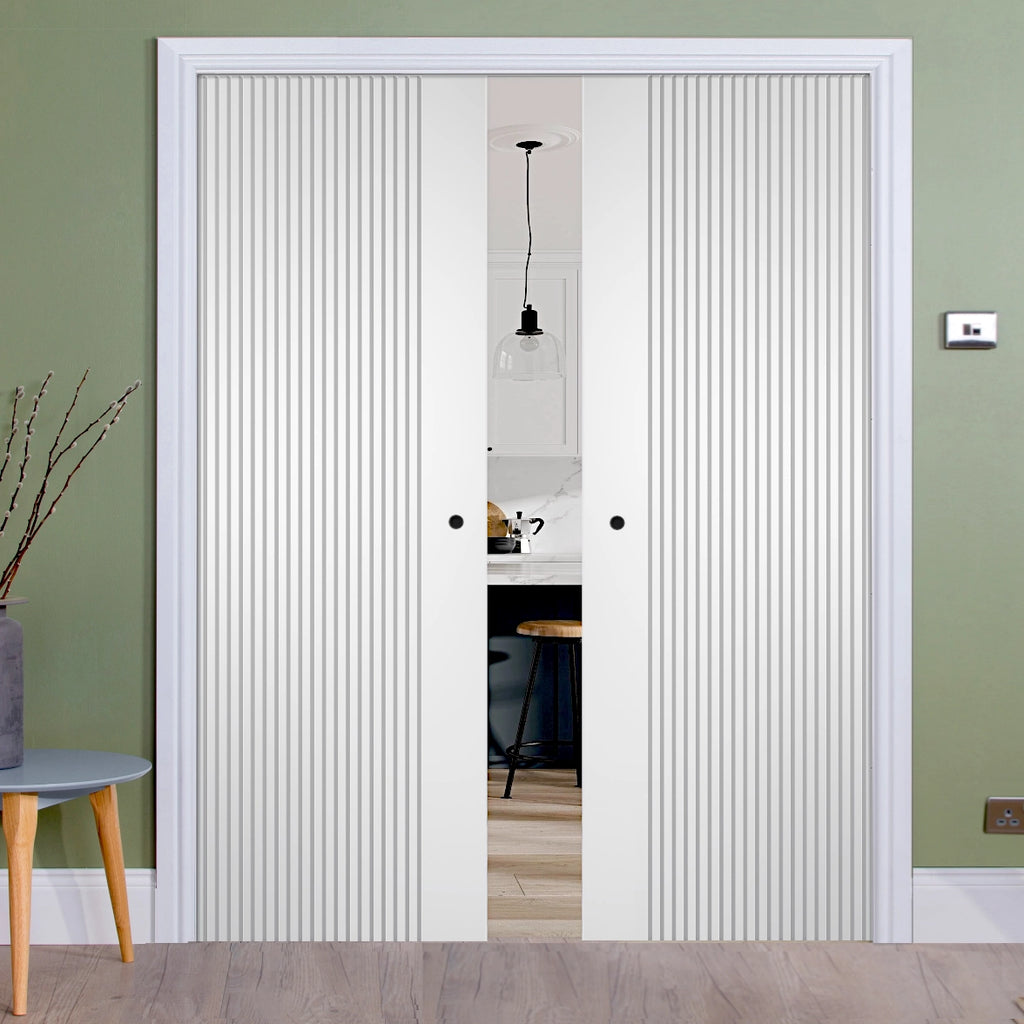 Introducing the Melbourne Grooved White Pocket Door Set, a refreshing update to our popular design. Available in a fresh and crisp primed white, the deep textured grooves add character and make it stand out in contemporary interiors. Elevate your interior with this unique and stylish addition.