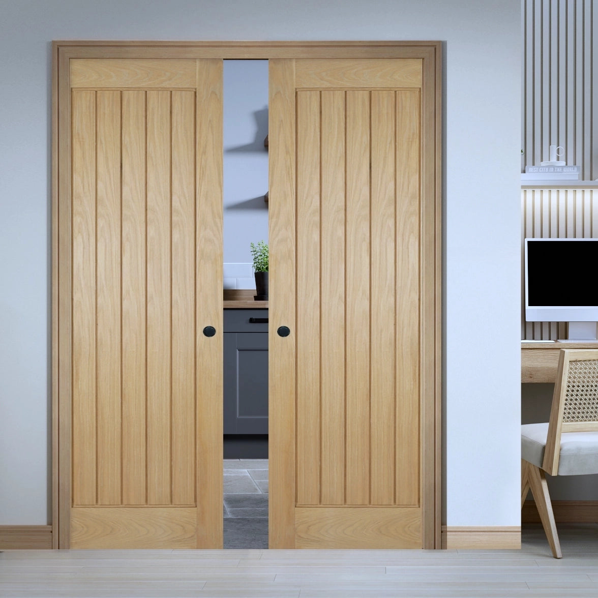 Enhance the look of your interior with the Mexicano Oak Double Pocket Door Set, this internal door pair is perfect for bedrooms and lounges. Its timeless panel design adds a touch of elegance to any room, supplied unfinished for a customizable finish.