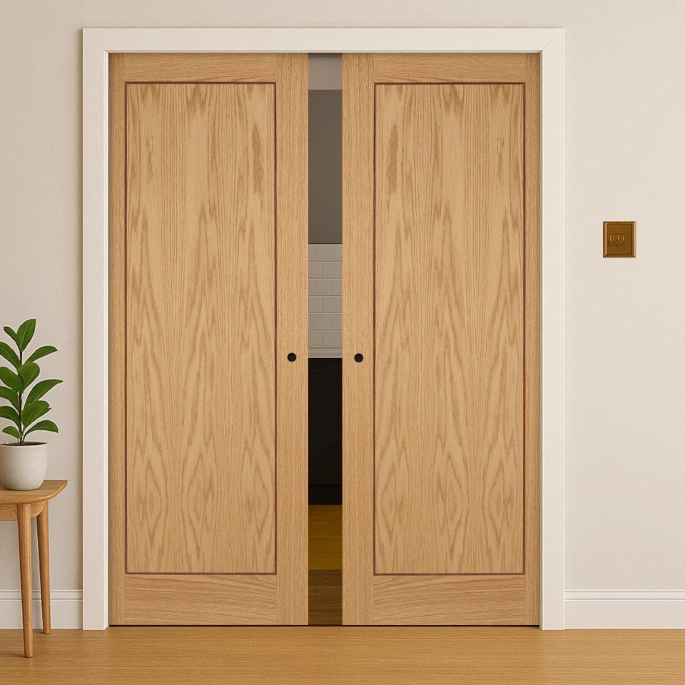 Contemporary Oak Inlay 1P Double Pocket Door Set