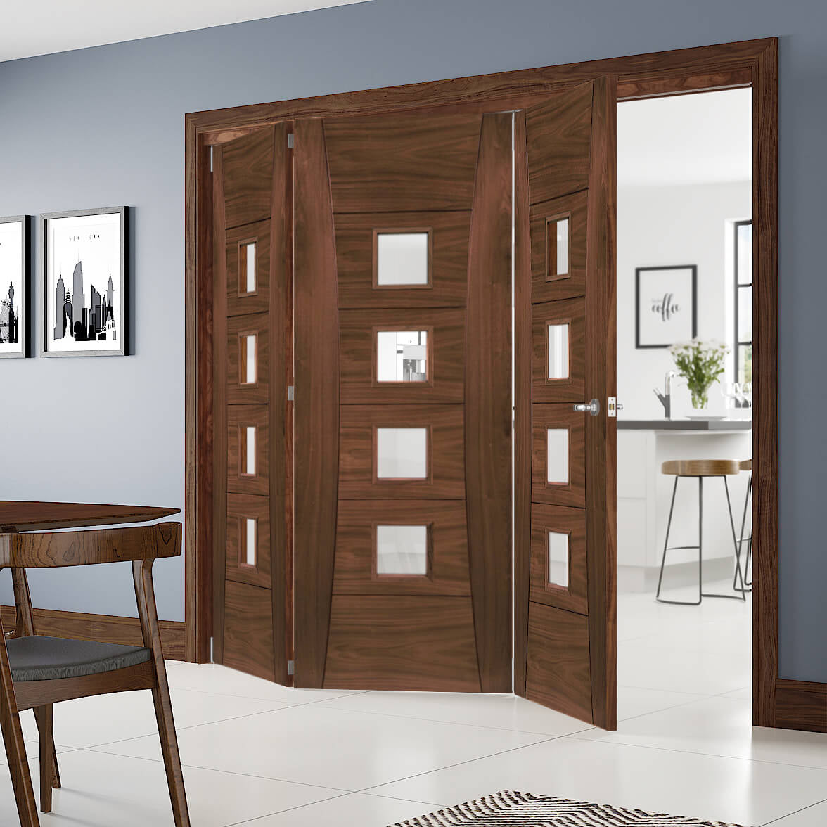 With sleek curves the prefinished walnut Pamplona is one of our most desirable doors in the contemporary door collection. The clear glass allows light to flow through rooms with 30 minutes fire rating.