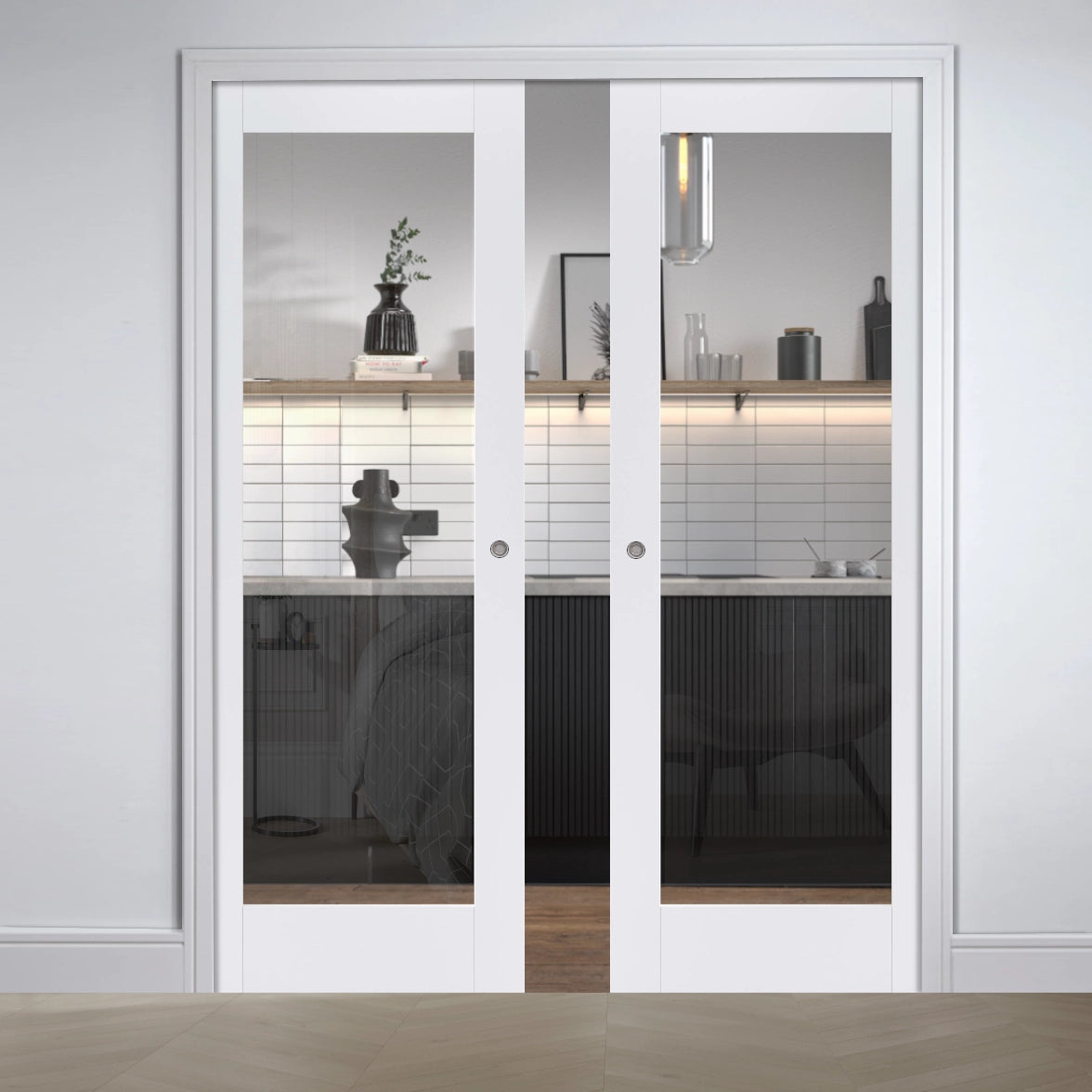 Pattern 10 White 1L Clear Glazed Double Pocket Door Set