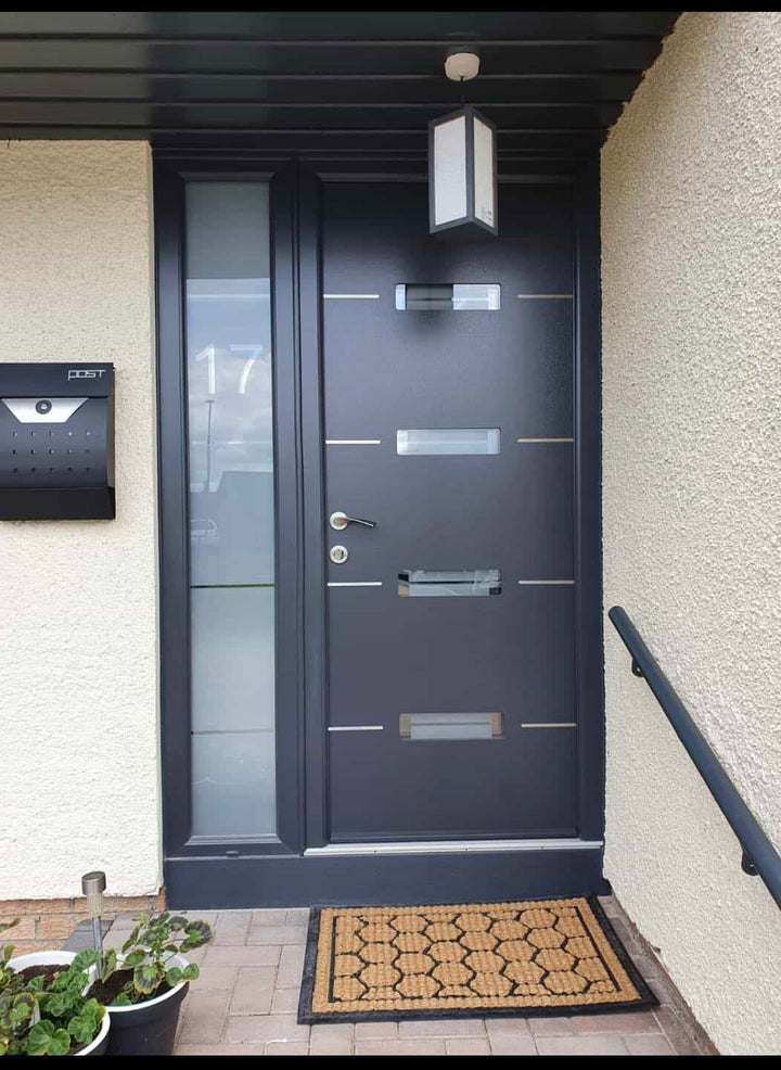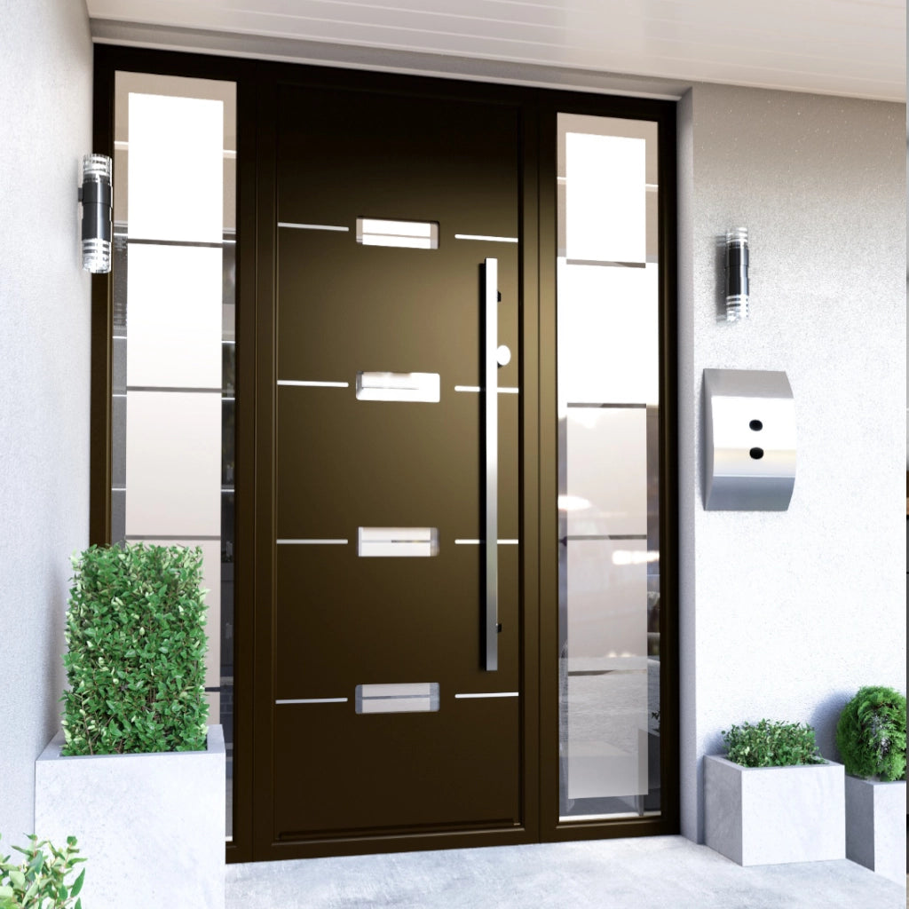 Elevate your home's exterior with the Platinum Bronze Madrid Custom Made External Door, a bold and modern statement piece with 4 central triple glazed glass panels. Crafted with precision and style, this door features a smooth Platinum Bronze finish complemented by four sleek horizontal aluminium inlays, offering a contemporary aesthetic that blends durability with design. Part of the Avant Garde collection.