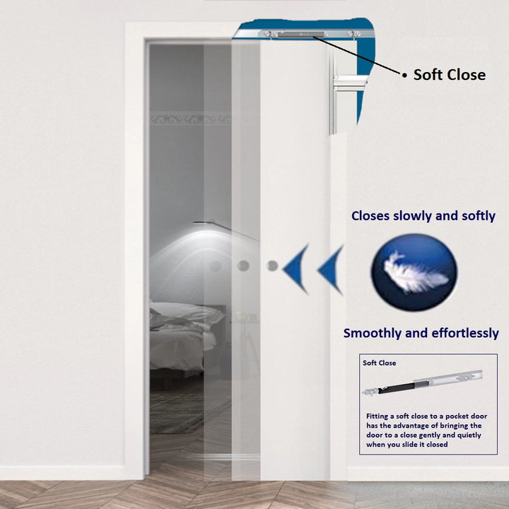 There is no bottom track or threshold strip, as with all our pocket door systems the single pocket door frame is top hung from a track. Inside the track, there are runners which are attached to the top of the door via a bracket. This means there is no threshold strip or track in the floor and your flooring can continue through the opening undisturbed. Accessories such as soft door closers, flush door pulls, and bathroom locks can all be purchased separately,