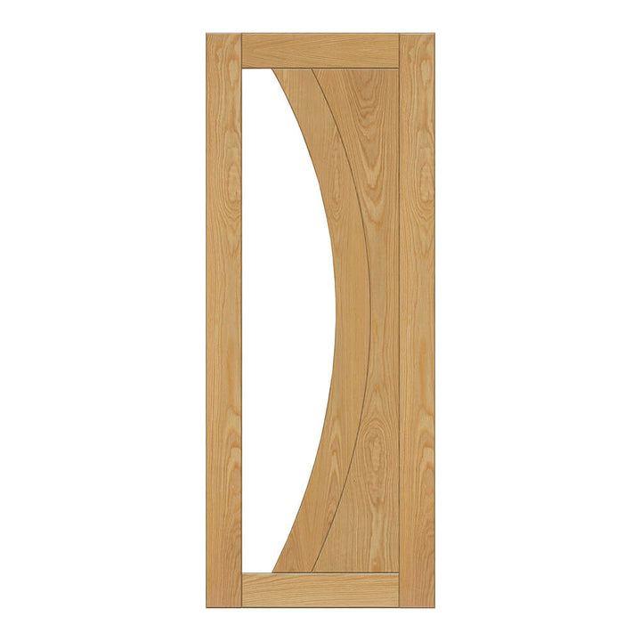 Create a contemporary look in your home with the Ravello Oak Clear Glazed Pocket Door Set. Its crown cut oak veneer creates a beautiful ripple effect that's complemented by its curved lines and clear, toughened glass pane. Enjoy a sense of space and light with this modern design.