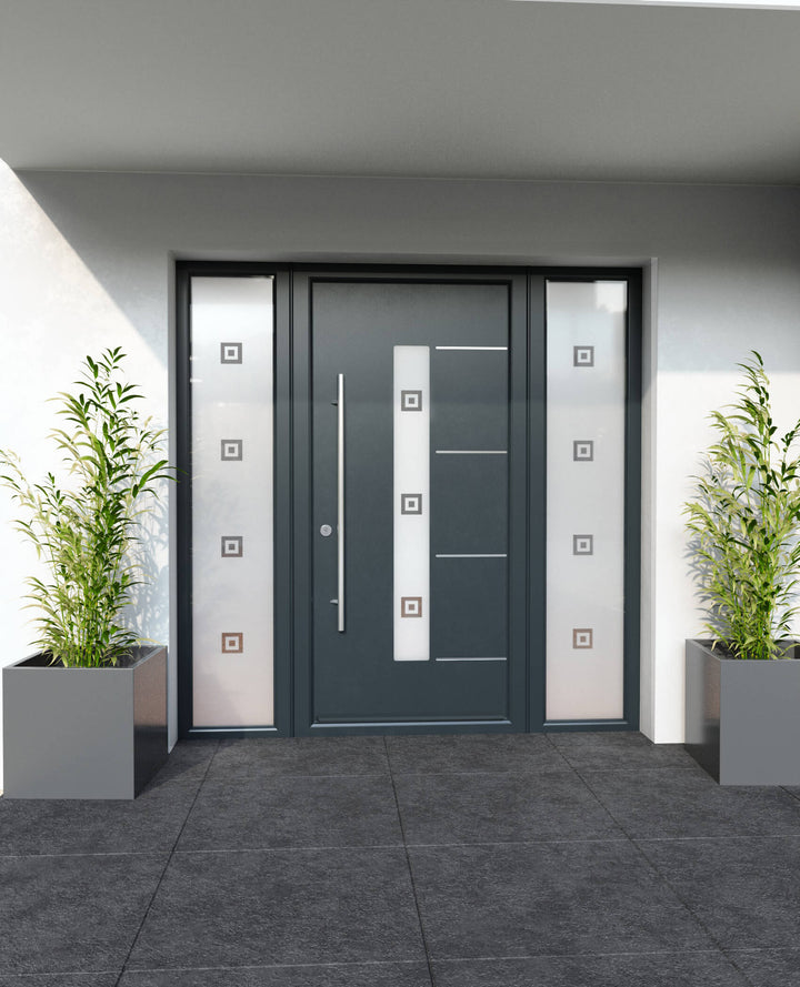 Elevate your home's exterior with the Silver Grey Matisse Custom Made External Door, a bold and modern statement piece with a central triple glazed glass panel. Crafted with precision and style, this door features a smooth silver grey finish complemented by four sleek horizontal aluminium inlays, offering a contemporary aesthetic that blends durability with design. Part of the Avant Garde collection.