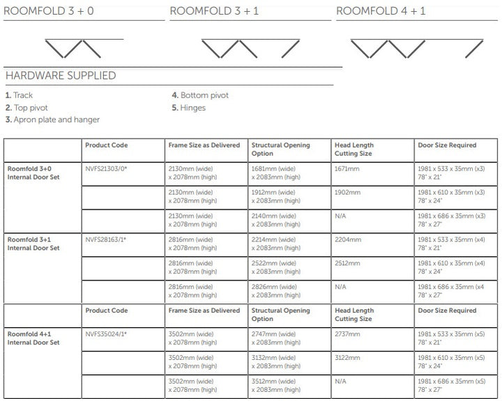 The Soho folding room divider is available in 3 configurations and 3 door sizes, a 3 leaf, 4 leaf and a 5 leaf system. The Frame is supplied complete with the Top Track, Top Pivot, Apron Plate, Bottom Pivot and Chrome Hinges. There is no bottom frame or floor guide with this door set therefore the flooring can continue between rooms. The frame is supplied in unfinished oak and would require finishing on site.